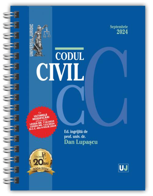 Lucrarea Codul civil Septembrie 2024 (ediție spiralată), îngrijită de prof. univ. dr. Dan Lupașcu și tipărită pe hârtie albă de calitate superioară, include ultimele modificări aduse prin: Legea nr. 116/2024; Legea nr. 122/2024; D.C.C. din 9 iulie 2024.